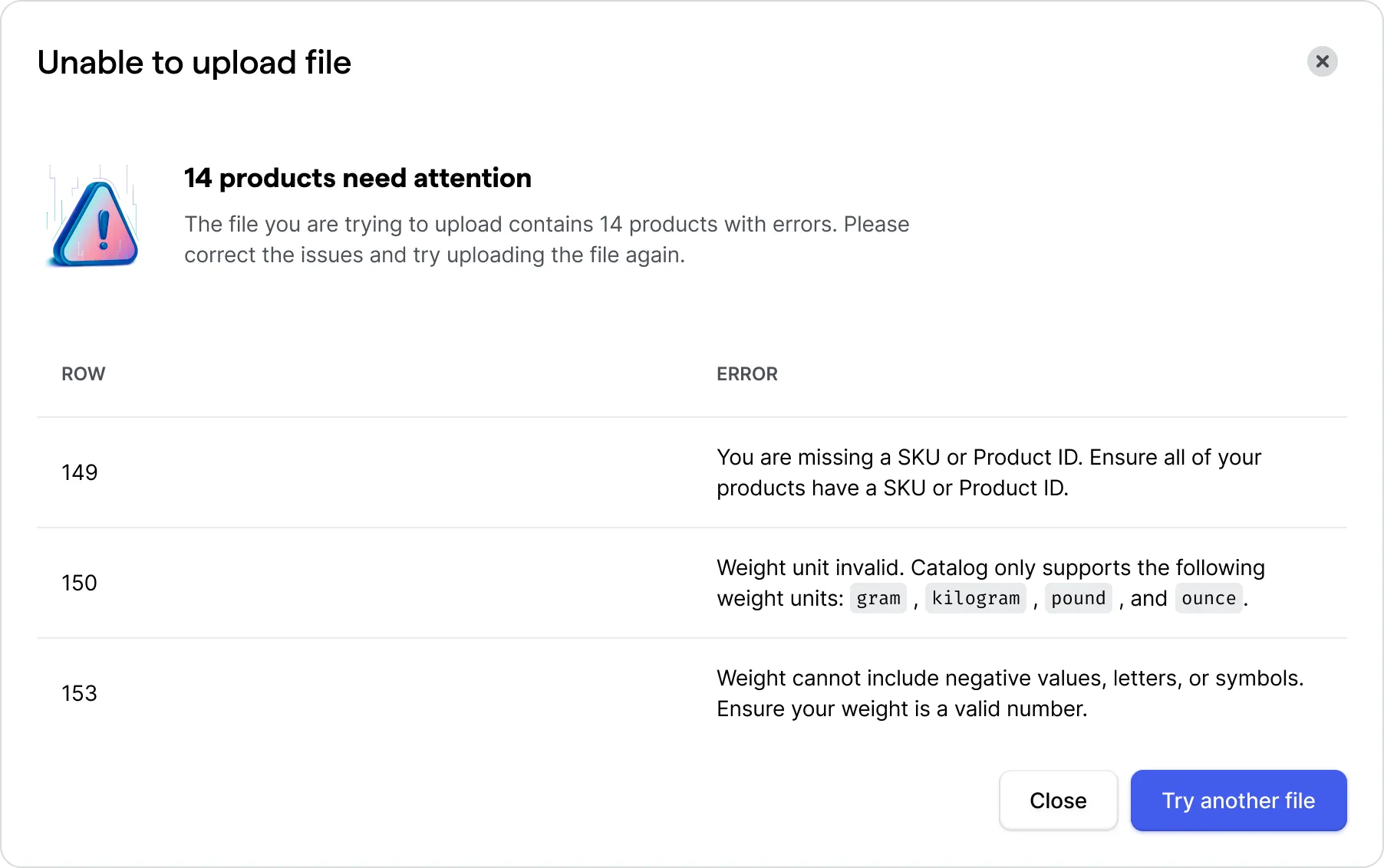 You might encounter errors when importing your catalog products. The following list describes import errors and how to resolve them. Once you resolve your errors, you can reimport your CSV.